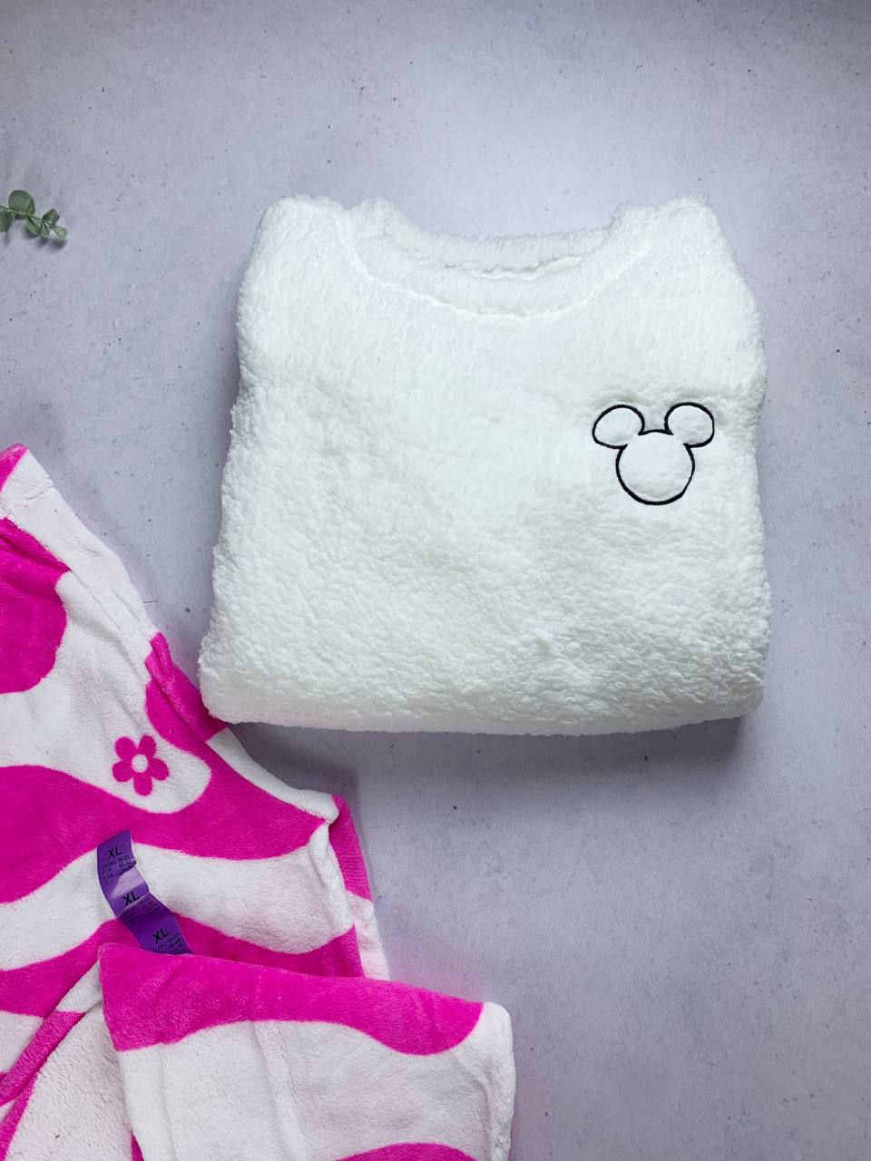 • Color/Pattern: Off-white top with small Mickey outline; white/pink wave pants.