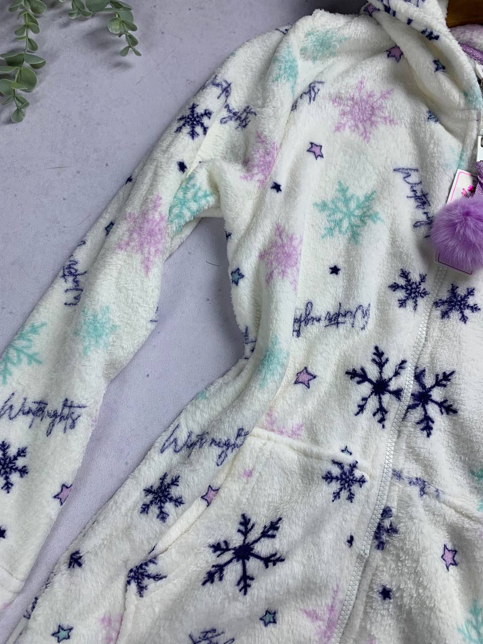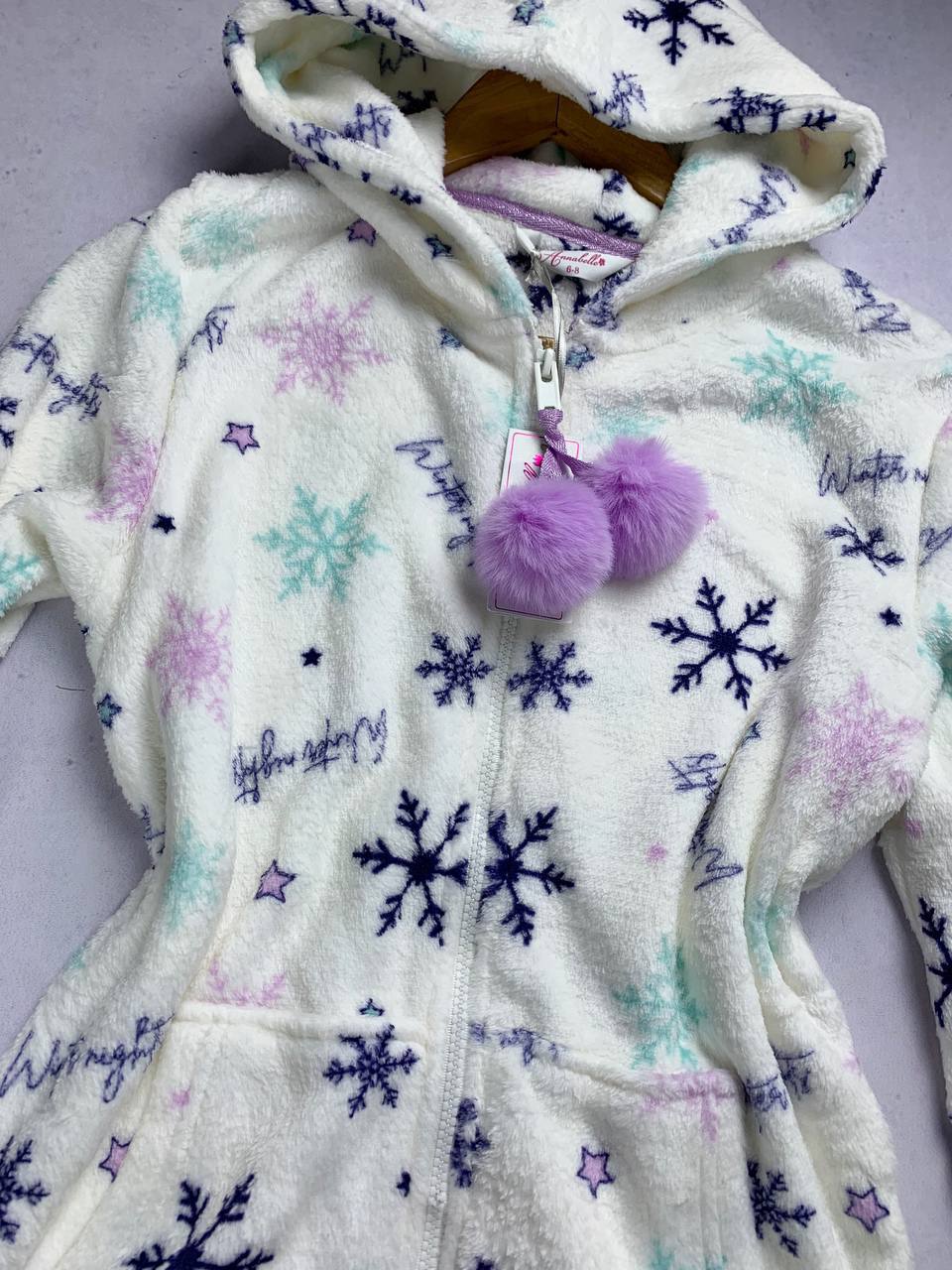 Color/Pattern: White base with pastel snowflake prints (purple, pink, turquoise).