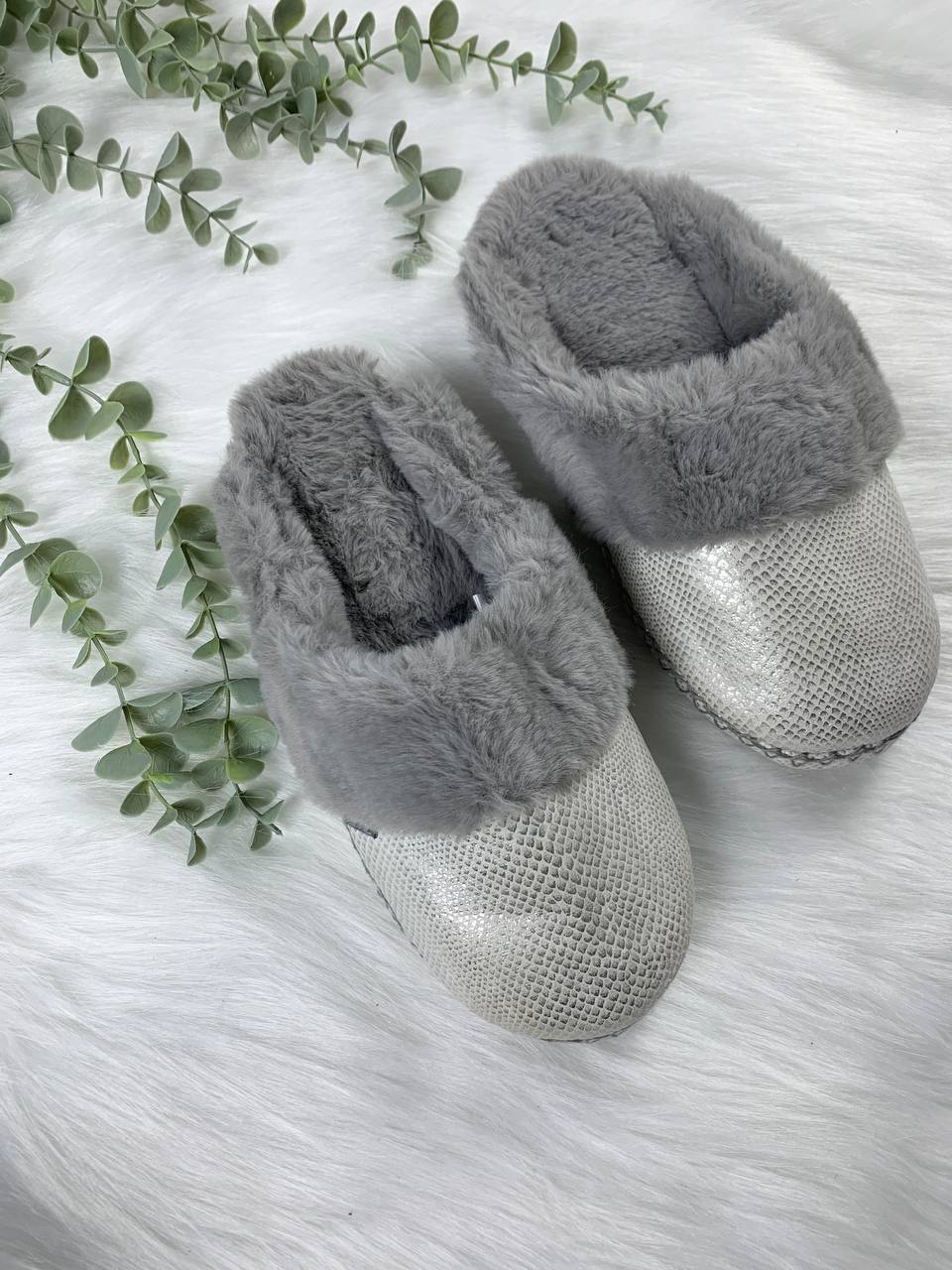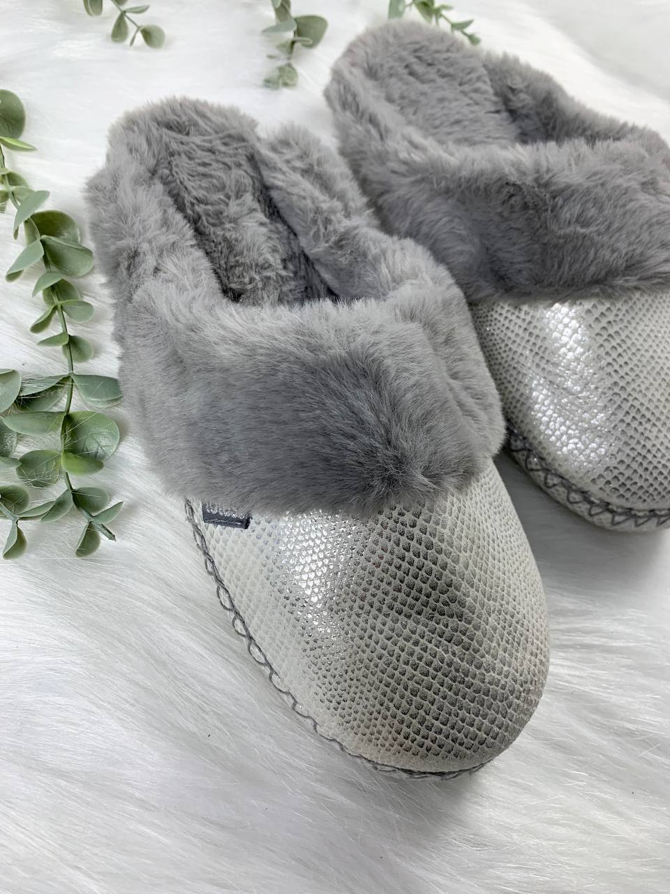 Material: Printed faux-leather upper (subtle metallic) + faux-fur cuff/lining.