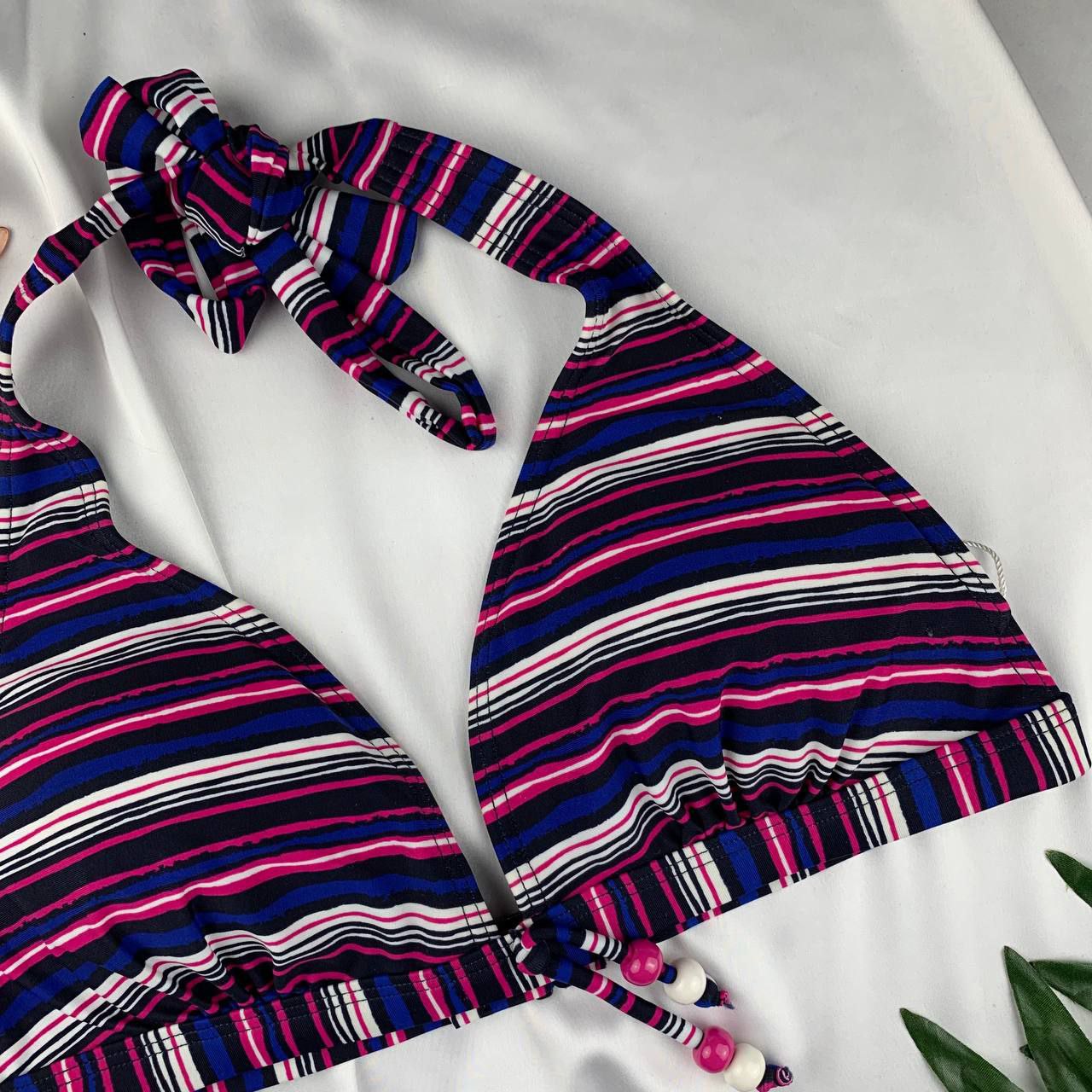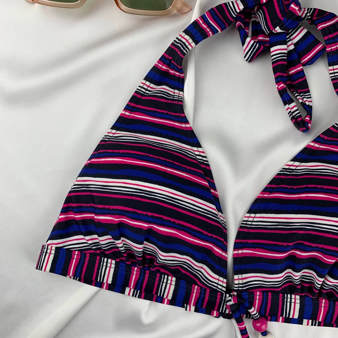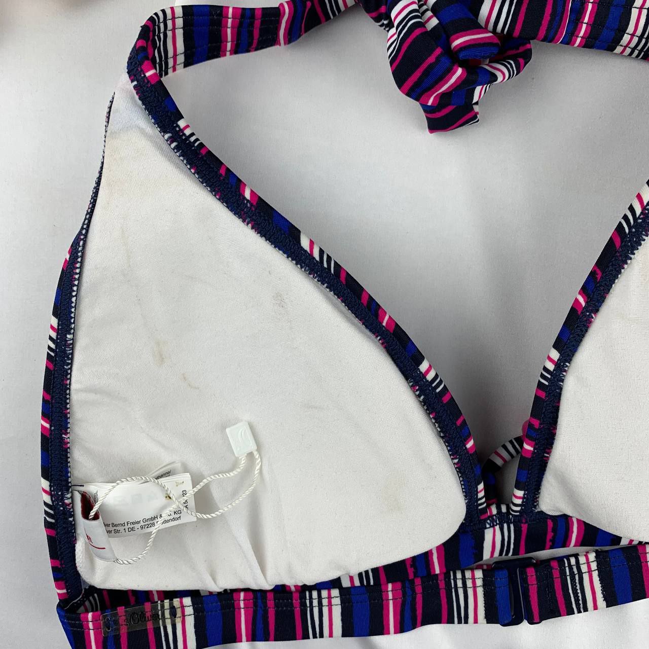 O.Oliver Triangle Halter Bikini Bra – unwired padded design with striped details and adjustable neck tie for chic comfort at the beach.